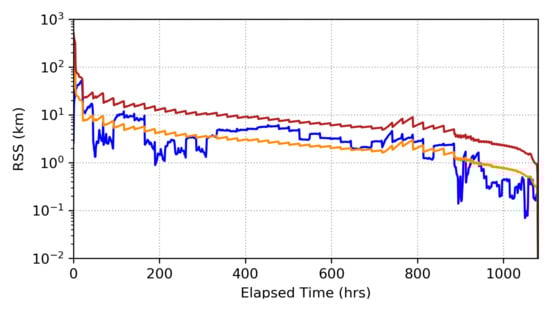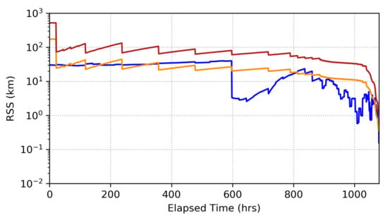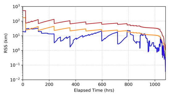 - Goff, G.M.; Black, J.; Beck, J.A. Orbit Estimation Of A Continuously Thrusting Satellite Using Variable Dimension Filters. In Proceedings of the AIAA Guidance, Navigation, and Control Conference, Kissimmee, FL, USA, 5–9 January 2015. [Google Scholar] [CrossRef]