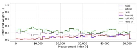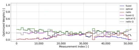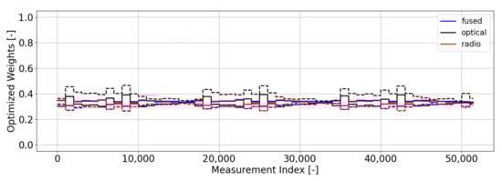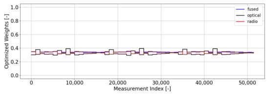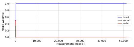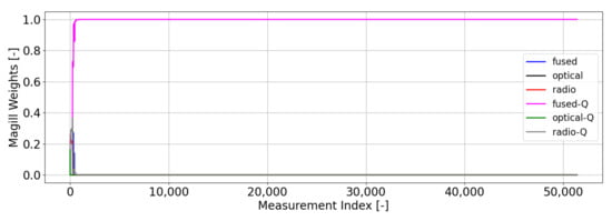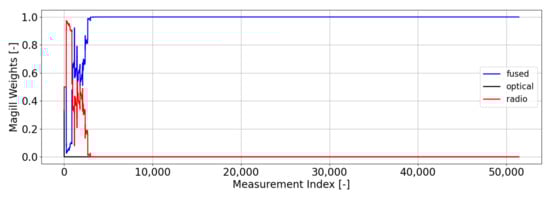 The weightings that come from our optimal gating network are shown in Figure 7. These weightings use a batch size of 1000 measurements (). Unlike the weightings from Magill’s gating network, we do not see a clear preference for any of the filters, which is an indication of a healthy (i.e., well-modeled) filter bank. Equal weightings occur when the measurement residuals and uncertainties output from the filters in the bank are statistically consistent with each other. When one or more filters begin to be preferred by the network (i.e., large weighting), this is an indication that at least one of the filters in the bank is not behaving in a statistically consistent manner—i.e., its residuals are either too large relative to its uncertainty (leading to a low weight) or its residuals are too small relative to its uncertainty (leading to a higher weight). Unlike the Magill weighting scheme, our optimal weighting scheme focuses on prioritizing filters that output residuals that are statistically small with no preference for how small the uncertainty of that filter is. Since each filter in this scenario is properly modeled, they will each output measurement residuals that are statistically consistent with their uncertainty metrics, thus resulting in nearly equal weights across the bank. In these types of scenarios, we would usually select the default filter to use for estimation purposes and conclude that no anomalies are occurring. In this instance, that default filter is the fused filter, since it is the best-informed filter.