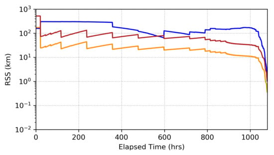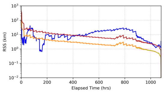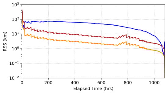 We begin our analysis by evaluating the filter performance in the absence of measurement biasing. The position error and uncertainty for each filter in the bank are shown in Figure 3, Figure 4 and Figure 5. In these results, we see that the optical-only filter (Figure 3) tracks the spacecraft at a level of 10–50 km (1-) until right before entry, where uncertainty deceases to the sub-kilometer level over the course of a few days. Conversely, the radiometric-only filter (Figure 4) tracks consistently at the 10 km level (1-) until immediately before entry where position uncertainty rapidly decreases to the sub-kilometer level, while radiometric-only tracking generally has a smaller square root of the trace of the position covariance (RTPC) level than the optical-only tracking, it should be noted that there is a period right before entry where optical-only tracking begins to outperform the radiometric-only tracking. The fused filter (Figure 5) consistently outperforms the other two filters throughout the duration of the simulation. Position uncertainty ranges between 1 and 10 km (1-, RTPC), generally decreasing with time, until about 4-days before entry when position tracking improves significantly. It should be noted, that each filter’s position error stays within its position uncertainty bounds, though the radiometric-only filter results show that the error is generally smaller than what the uncertainty metrics dictate that it should be. This may be indicative of over-inflating radiometric data-weighting, which would result in larger uncertainties than the available information would otherwise indicate. However, this is a single realization of error in this system, so it cannot be taken as fully representative of the system’s more general error response behavior.