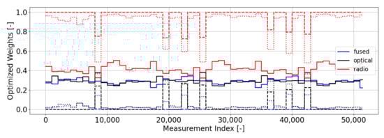 Our optimal gating network’s weights for this scenario with biased optical measurements are shown in Figure 11. The rigidity of the Magill weighting scheme is contrasted by our optimal gating network, which can be retooled to ignore unprocessed measurements when computing filter weights. The weights show a clear preference for the radio solution, and this preference becomes more significant as the size of the bias in the optical measurement grows. As previously discussed, the fact that the filter weights deviate significantly from their nominal values (i.e., equally weighted at ) can be viewed as a sign of mis-modeling in the system. Because the radiometric solution is clearly preferred, we can assume that the source of the mis-modeling is something to which the optical-only and fused filters have greater sensitivity (e.g., biasing in the optical measurement model).