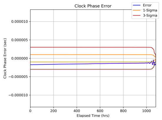 Further investigating the effect of these radiometric biases, the clock phase uncertainty and error statistics from the fused filter are shown in Figure 14. When processing un-biased radiometric data, the fused filter outputs clock errors that are near 0- in size; however, when the large radiometric bias is introduced the filter now outputs clock error in the range of 1–2 . More specifically, the clock error is approximately 2 s, which is what should be expected from the 500 m range bias that we introduced. Essentially, this result shows that the filter absorbed the range bias into the clock error modeling in a way that is not statistically anomalous. This is why the fused filter is still able to output accurate state estimates despite being given biased radiometric data. By turning down the clock phase uncertainty, we would be able to better detect smaller radiometric errors; however, it is important not set the clock uncertainty too low where the filter becomes susceptible to divergence from realistic/anticipated clock errors.