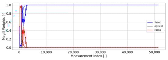 When applying the Magill-based gating network to this filter bank in this nominal scenario, we obtain the results depicted in Figure 6. The results show a clear preference for the fused and radiometric-only filter for the first portion of this approach phase. This makes intuitive sense because each filter is exhibiting nominal behavior (i.e., no anomalous measurement residuals), and the fused and radiometric-only filters produce solutions with significantly smaller state uncertainties. Beyond the first portion of approach, the fused filter begins to dominate the weightings because the aggregate information from both radiometric and optical data types begins to dominate over the less-informed radiometric-only solution. These results essentially tell us that the fused filter is overwhelmingly the best performing filter in the bank under the standard MME criteria (i.e., small measurement residuals and small innovations uncertainty).