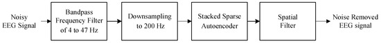 EEG signals, which reflect the stress caused by audiovisual stimulation, are recorded using noninvasive multichannel electrodes, preprocessed, and analyzed spectrally. An EEG signal is a fine electrical signal tens to hundreds of microvolts (µV) in magnitude and includes various noise components along with signals generated in the actual brain. As shown in Figure 2, preprocessing consists of four steps and is used to remove noise from EEG signals to facilitate subsequent sentiment analysis. During preprocessing, high- and low-frequency noises are first removed by applying a 4 to 47 Hz bandpass filter to the EEG data. The EEG data is then downsampled to 200 Hz, and ocular artifacts are removed using deep learning-based stacked sparse autoencoder [18]. Subsequently, the spatial difference of the original signal is improved, and temporal information is maintained through the spatial filter [19] to which the eigen decomposition is applied.