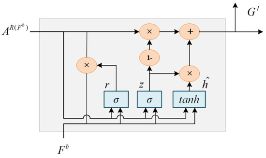 where σ(.) denotes the element-wise sigmoid function; W, L, and b indicate the learnable weights and biases, defined as r, z, and h, respectively; ; and d represents the size of the hidden dimension.