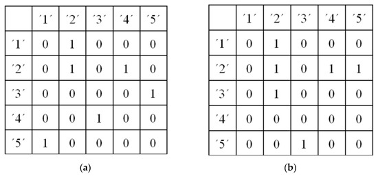 The directional weighted adjacency matrix constructed from the temporal adjacency relationship for symbol sets A and B. (a) The adjacency matrix for the symbolized set A; (b) The adjacency matrix for the symbolized set B.