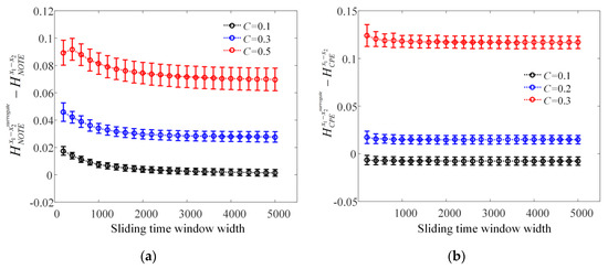 The appropriate signal length was determined by investigating the effect of the width of the analysis window on the results. For the time series and obtained using the unidirectional coupled Henon model under a certain coupling strength, the surrogate data were first calculated by surrogating using iAAFT (iterative amplitude-adjusted Fourier transform with five iterations) to mimic the random coupling state. Next, the sliding time window with a fixed moving step of 500 samples was chosen to segment the paired time series and and and . The purpose of using the sliding time window is to enhance the effect of data analysis. The width of the sliding window width was increased from 200 to 5000 samples with a step of 200 samples. With each window width, the coupling strength between and and between and was calculated using the CBTN for individual sliding windows, obtaining the and , respectively. The differences were first calculated for individual windows and then averaged across windows as the measured difference. The same procedure was repeated for 30 times with each window width and then averaged across repetitions to obtain the average and standard deviation of the measured difference. The coupling strength between and was set to 0.1, 0.3, and 0.5, respectively, and the results are shown in Figure 2. Figure 2a shows the results of the CBTN method and Figure 2b shows the results of the CPE method. It can be found that the two methods can make a good distinction between different coupling strengths. The CPE method can reach a stable state when the window width is less than 1000 samples, and the CBTN method can reach a stable state when the window width is more than 2000 samples. It was speculated that the CPE was appropriate for the analysis of short time series when it was proposed. Therefore, the appropriate window width for the CBTN is 2000 samples. It should be noted that the differences had a negative value with the CPE method when the coupling strength was 0.1. This is inconsistent with the theory and indicates that the CPE was not capable of differentiating the weak coupling state.