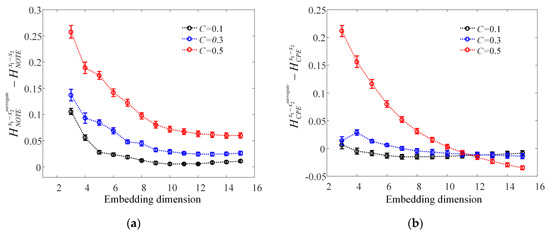 From the definition of CBTN, we can see that the unique parameter relevant to the CBTN is the embedding dimension . The parameter defines the embedding spatial dimension of a given time series. Another noteworthy issue is the appropriate signal length in order to obtain reliable results. One fact is that the signal length is limited, and the other is that the calculation process can only be performed in one window. The values of these two parameters determine whether the results of the analysis can be described or not and whether it is possible to extract the deep relationships hidden between the two time series. Here, the determination process of these two parameters is explained by analyzing the unidirectional coupled Honen model with the deterministic coupling relationship. It was selected because the theoretical value of each expected return can be calculated. Based on this theoretical value, it can be evaluated whether the result obtained with a specific parameter setting can converge reliably and stably to the expected value or not. In addition, in order to highlight the impact of the CBTN on the analysis result, the CPE results for the same objects were used as a comparison. When the CPE was used, the embedded dimension was 5 and the delay time was 2.