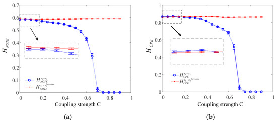 After the embedding dimension and the sliding window width were determined, the CBTN was used to analyze the unidirectional coupled Honen model under different coupling strengths . Specifically, the coupling strength increased from 0 to 0.9 with a step of 0.05. For a given coupling strength, the data of , and within individual sliding windows were analyzed using the CBTN and CPE methods, respectively, to obtain the , , and . The procedure was also repeated 30 times under each coupling strength, and the mean value and the standard deviation across 30 repetitions were calculated. Figure 4 illustrates the average value of , , and across all repetitions under different coupling strength levels. In the figure, the dashed boxes indicated by the arrows are partial zooms of the analysis results. As can be seen from Figure 4, the greatest difference between the analytical results of CBTN and CPE was mainly in the part where the coupling strength was less than 0.2. In this part, the CBTN method gives correct analysis results, while the CPE calculation results are greater than the values under the random coupling state, which is inconsistent with the theory. The possible reason is the CPE method that is based on the probability distribution statistics of symbols cannot distinguish the interactions between time series under weak coupling conditions. In contrast, the proposed CBTN method has good detection capability of interactions between time series with a weak coupling strength.