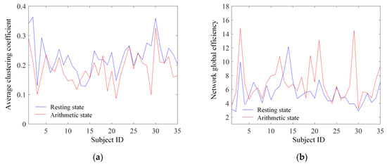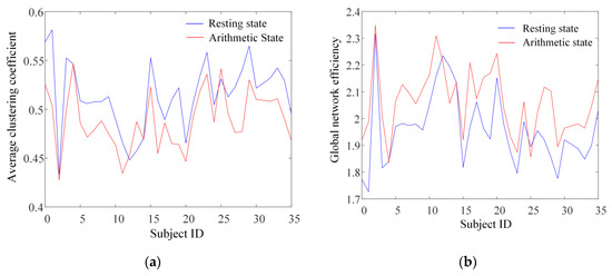 In order to confirm whether there were group differences in the EEG signals between the resting and arithmetic states, the mean adjacency matrix of each subject was constructed using the CBTN, and the network parameters of the mean adjacency matrix were extracted for each subject. The same procedure was performed using the CPE as comparison. The EEG data within each sliding window were analyzed using the CBTN to build a complex network, and its adjacency matrix was obtained. All adjacency matrices from the same subject under the same state were averaged. The clustering coefficient and the global network efficiency of the average adjacency matrix were used as a feature for each subject. In this way, the feature in the two states was obtained for individual subjects. The results obtained for all subjects are shown in Figure 5. It can be seen that for most subjects, the mean clustering coefficient of the arithmetic state was smaller than that of the resting state and the global efficiency of the arithmetic state was greater than that of the resting state. This means that the network in the prefrontal area was more efficient and had enhanced information processing capacity during the arithmetic state. It also means an increased cognitive load during the arithmetic state. Figure 6 shows the analysis results of extracting the features of the complex network constructed by the CPE method under two states.