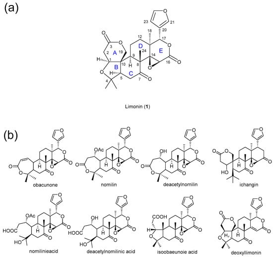Limonoids are a class of natural compounds in plants, mainly found in the tissues of Meliaceae and Rutaceae plants. They are the most abundant among the plants in the Rutaceae family, especially in the fruits and seeds of citrus, such as pomelo, sweet orange, and lemon [1]. More than 130 natural limonoid compounds have been isolated and identified from plants belonging to the Meliaceae and Rutaceae families [2,3,4]. The structures of some compounds are illustrated in Figure 1.
