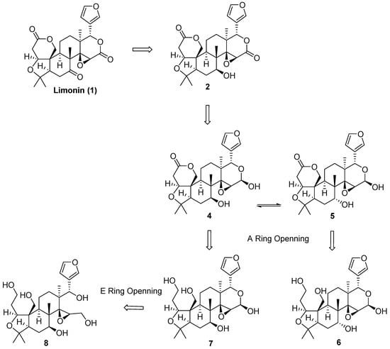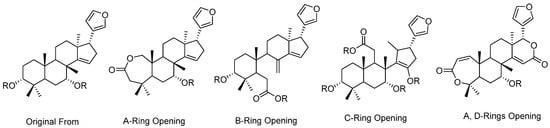 Limonoids, which are biosynthesized from euphane or tirucallane triterpenoids, can be divided into three categories, based on their chemical structures: limonoid aglycones, degraded limonoids, and limonoid glucosides. Among them, limonoid aglycones are the most abundant. Degraded limonoids are produced from limonoid aglycones by losing two rings, while limonoid glycosides are obtained by combining limonoid aglycones with glucose at the C-17 position via a glycosidic bond. Limonoid aglycones can be further categorized into the following five types according to their chemical structures and ring-opening forms: original form, A-ring opening, B-ring opening, C-ring opening, and A, D-rings-opening [4], of which the structures are shown in Figure 2.