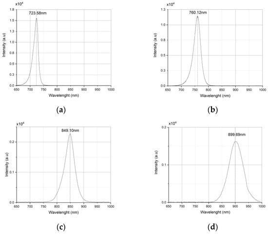The wavelength spectra for LED wavelength of: (a) 740 nm; (b) 760 nm; (c) 850 nm; (d) 900 nm; and (e) 940 nm.
