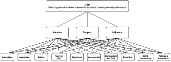 The application of AHP begins by constructing multiple logical hierarchies for the systematic assessment of the enablers by making pairwise comparisons for each of the selected criteria against the goal. Our goal is to select Control Enablers that primarily contribute to the security control performance, and our chosen criteria are Mandate, Support, and Influence, which are the qualifying criteria that were stated earlier. Then, the candidate enablers were mapped with the hierarchical structure, as illustrated in Figure 2.