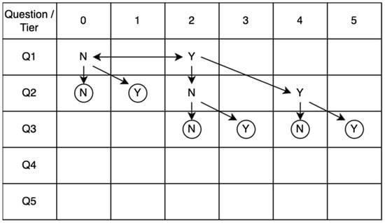 To further improve our measurement method, we use a question path to optimize the number of questions each respondent needs to answer. Rather than answering a fixed set of questions to determine performance levels (usually Maturity Levels) [,,], the question path provides dynamic questions that are presented to the respondent based on their previous answers. There are many possible paths, but the most optimized path was selected and presented in Figure 3. The path begins with question 1 (Q1), which aims to verify whether the base measure achieves Capability Tier 2 or not. Upon answering yes, the path continues to the right and the respondent is presented with Q2, which verifies Tier 4 achievement, and then Q3, which verifies Tier 5 achievement. The circle symbol represents the end of the path and the final Tier being achieved. Whenever the respondent answers no, an alternative question will be presented to measure a different Tier achievement, continuing until reaching the end of the path.