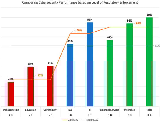 We can see from Figure 5 that telecommunication (90), information technology (85), and insurance (84) are the leading sectors, whereas government (41) and education (40) are lacking sectors, which is consistent with the results of other studies [,]. Transportation (25) is the least promising sector with the lowest score in our study. It is important to note that the leading sectors in our results have well-established regulators who exercise an active role in driving cybersecurity practices. On the other hand, the regulators of the lacking sectors have yet to proactively enforce cybersecurity practices among their regulated organizations. The driving force of regulators indeed provides an answer to part of RQ2, specifically the external driving factor. In addition, these results show logical coherence with the surveys performed by ITU [] and McKinsey and Company [] in that the regulated industries with active enforcing regulators progress toward a more decent cybersecurity performance.