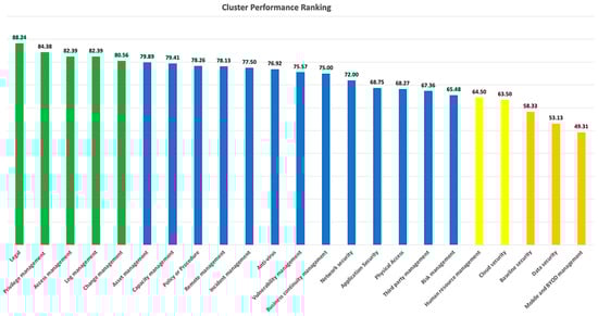 From the results, 48.6% of the measured organizations have strong cybersecurity performance (34.3% got an A grade and 14.3% got a B). On the other hand, more than half of the measured organizations (51.4%) have weak cybersecurity performance (C, D, and F grades). Ten organizations (28.6%) received an F grade, which indicates a very weak cybersecurity posture and requires immediate improvement. The results show a degree of consistency with the cybersecurity maturity survey of 114 companies that was performed by McKinsey and Company in 2021 [], which pointed out that most of the surveyed organizations (70%) have not reached the mature cybersecurity state. Another research study conducted in 2016 [] also summarized similar results, with 75% of the surveyed organizations having significant cybersecurity risk exposure and only 25% being considered mature. This fact highlights the difficulties and challenges in managing cybersecurity risks as the number of mature organizations remains unchanged from the past up to the present.