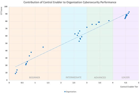 The R value is 0.8703, which indicates a strong linear relationship between the Control Enablers and the cluster scores []. The R-Squared is 0.7574, which indicates that 75.74% of the variance in the cluster scores can be explained by the capability of the Control Enablers. The overall p-value is 0.00003, which is less than the significance level (<0.001) and was demonstrated to be, overall, statistically significant. A regression analysis of other organizations also yielded results in the same direction. Hence, we can conclude that the Control Enablers are a good fit for the model. Each individual coefficient of the Control Enabler has a positive value, thereby interpreting the positive contribution to the organization scores. The OP has a high significance (p-value < 0.05) and indicates that it is the most important Control Enabler that helps drive an organization’s cybersecurity performance. Our findings are consistent with the study of Bahuguna, Bisht, and Pande, who conducted a study on cybersecurity maturity in Indian organizations through facilitated table-top exercises (TTX) and self-assessment questionnaires []. They reported that effective policy implementation is the first priority for improving the cybersecurity maturity of organizations. This also corresponds to the findings of Prislan, Mihelič, and Bernik [], which indicated that the area of information security policy and compliance play an important role in the degree of information security development.