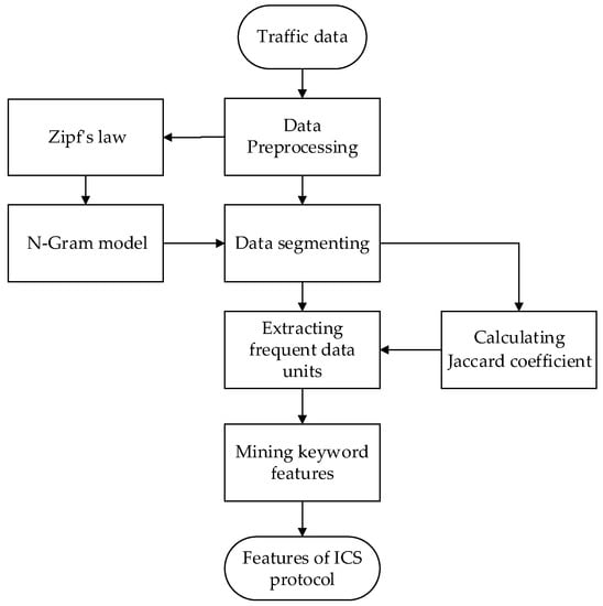 The process of feature extraction is shown in Figure 1. Data preprocessing strips the protocol payload from the original network data packet, unifies the data length, and converts it into hexadecimal form for subsequent processing. N-Gram model is used for protocol data segmentation, and the value of N is determined by Zipf’s law. A large number of length N data items can be obtained after the segmentation. Although it contains frequent and meaningful data items, more are meaningless redundant data units. We use the Jaccard coefficient to filter useless data items and obtain frequent item sets. Finally, the keyword features of the protocol are mined using association rules.