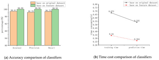 We take 80% of the samples in the original dataset and feature dataset as the training set and 20% as the test set, then train the decision tree classifier and test the performance of the classifier. The accuracy and time cost comparison of the two classifiers are shown in Figure 7, and the precision and recall rate of a single category are shown in Table 5 and Table 6. The results show that the feature dataset removes the interference features in the original data. The decision tree classifier trained with the feature dataset is more concise and efficient; the average precision of the classifier is 99.99%, the average recall rate is 99.98%, the training time is only 0.34 s, and the predicting time is only 0.264 s, outperforming the classifier trained by the original dataset.
