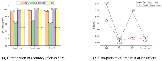 Accuracy and time cost comparison of classifiers based on different ML methods.