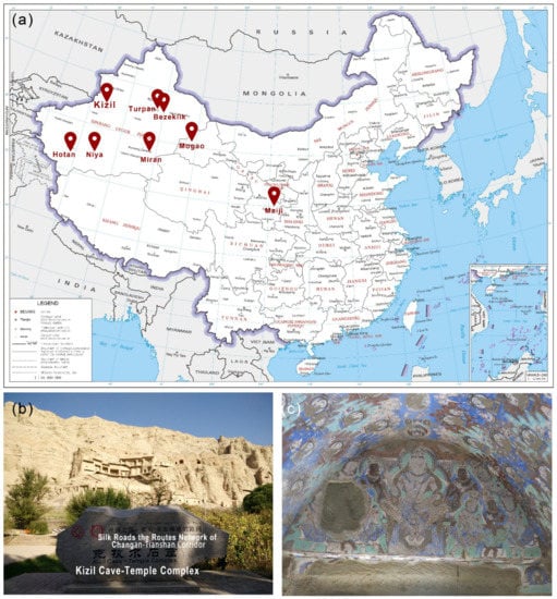 (a) The location of Kizil grottoes and important ancient Buddhism grottoes along the silk road in China; (b) the front view of Kizil grottoes; (c) a mural painting in Kizil grottoes (Cave No. 171, fifth–seventh century AD).