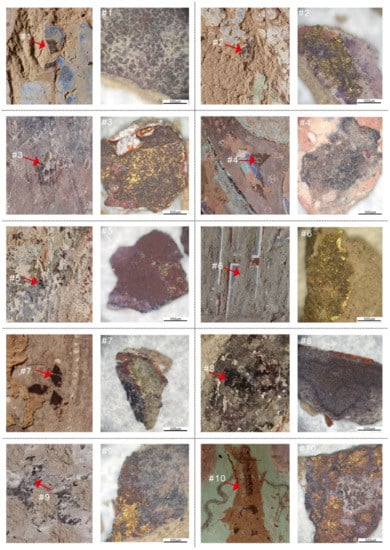 Sampling locations and microscope images of the samples used in this study. The red arrow in the images means the sampling location.
