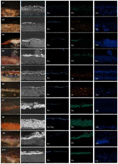 Figure 3 illustrates the optical and SEM cross-section images and elemental mappings. As the OM images show in Figure 3, all samples except #1 had relatively clear layers. Except for #1 and #4, clear gold could be observed in all samples. As mentioned above, most surfaces were coated with gold, and the colors of the layer beneath gold varied, include purplish red, orange, brown, blue, and white. The results of elemental analysis showed that Au (gold) was detected in all samples. In addition to Au, Ag (silver) was detected in sample #8. Ag was mixed with Au, whereby Au dominated in the elemental mapping; thus, Ag can be considered as an impurity in the gold. Although the golden color was not visually apparent in sample #1, it can be seen in the elemental distribution map that Au was scattered in Pb and Ca. This suggests that Au distributed in #1 was not in the form of foil but in the form of powder, mixed with a substance containing Pb and Ca. In #2, gold leaf with some Fe-containing red particles was identified in the upper layer, while characteristic elements such as Hg, Pb, and Ca were absent in the mordant layer. Sample #3 exhibited a thick red organic resinous layer beneath the gold foil, and, under the red organic layer, there was an orange layer with Pb. In #4, there were three red layers above the white ground, containing Pb + As, Ca + As, and Ca + Fe. Sample #5 had a distinct thick red layer on the upper gold layer, while a blue layer was beneath the gold foil. Sample #6 had no obvious element detected under the gold foil. Sample #7 presented a Pb-containing orange layer as mordant and a small number of red particles in the upper layer that also contained Pb. In #8, a red-black material was found in the upper layer, along with a dark-red layer and Pb concentrated orange layer under the foil. In #9, a thicker orange-red layer was visible in the upper layer where Pb and Ca were present. Sample #10 showed a thick red organic resinous layer beneath the gold foil, followed by an orange layer with Pb.