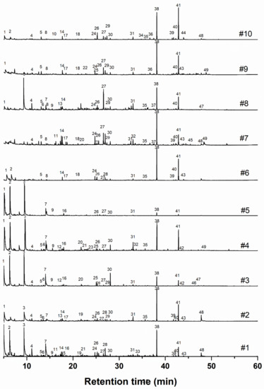 Identified pyrosis compounds are summarized in Table 3, and the TIC is illustrated in Figure 4. Samples #1, #2, #3, #4, #5, and #8 showed 1-methylpyrrole-2-carboxylate at 14.09 min (No. 7), followed by amino acids L-aspartic acid (No. 16), glycine (No. 1), and sarcosine (No. 9), suggesting the use of proteinaceous substances such as animal glue. In addition, phenol (No. 24) is one of the main pyrolysis products of casein and egg white [15], detected in samples #1, #2, #6, #7, #8, #9, and #10. Heptadecanenitrile (No. 36) and octadecanenitrile (No. 39), which have been identified as markers of egg yolk [15,16], were detected. However, the concentration of the detected compounds was low, and cholesterol, the characteristic marker for egg was absent; therefore, it was difficult to determine the type of protein.