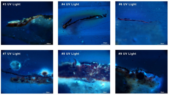 In contrast, as shown in Figure 5, red fluorescence could be observed in samples #3, #7, and #9 (a small amount of fluorescence could be seen in sample #8), most likely originating from the lac resin which presented orange fluorescence under UV light [24,25]. In addition, partial orange fluorescence was identified from the upper film layer of foils #4 and #6. Samples #6 and #8 were not found to be characteristic of lac resin in the Py-GC/MS results, probably because too few residues were present to be detected.