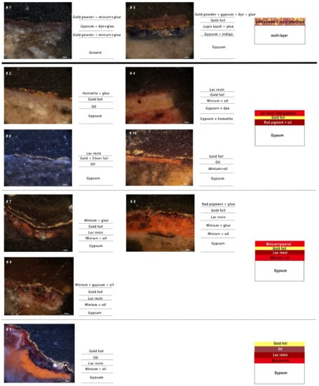 The UV fluorescence images, as well as the stained UV micrographs, are collated in Figure A5a,b. The fluorescence color of sample #1 was not obvious; the fluorescence in the image after FITC staining indicates where protein may have been used. Orange fluorescence could be observed in the UV images after RhOB staining except for #1 and #9. The yellow fluorescent layer in #2, #3, #4, #6, and #9 was located below the gold foil and mixed with lead red. Samples #3, #7, #8, and #9 had lac resin below the foil. The bright-white fluorescent layer in samples #3 and #10 was particularly evident, indicating the presence of the dry oil used as mordant to bind the foil. In sample #1, gold existed as powder, which may have been mixed using animal glue due to the lack of obvious orange fluorescence material shown in RhOB staining. In addition, the layers above the foil could be seen clearly under fluorescence microscopy in #2, #6, #7, and #9. The upper layers over gold foil of #2 and #7 showed green fluorescence under UV light after FITC staining, indicating possible proteins; the upper layer of #6 was red under UV, indicating lac resin. The upper layer of #9 was orange after RhOB staining, probably suggesting a layer composed of lead red with oil. The results of fluorescence microscopy observation are summarized in Table 4.