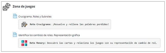So, after reviewing and adding the digital games to the virtual platform, the experimental phase of the research began. In both groups, the distribution of the sessions, the contents, the evaluation and the grading criteria, except for the interactive activities attached to the DGBL methodology, was the same. So, the difference between the experimental and control groups was mainly due to the availability of digital games, compared to the traditional methodology in the control group. The division of the experimental groups is as follows: competitive experimental group (EGc, n = 21) and individual experimental group (EGi, n = 17) were ultimately randomized. The students in the experimental group were able to play ten games (Table A1 in Appendix A). Two digital games of each type were created for the research: crossword, interactive picture, memory game, word search and role videogame. The experiment was conducted over two months (Figure 1 and Figure 2).