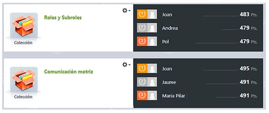 The games were the same for both experimental groups; the only difference was the gamification game elements. Students in the noncompetitive experimental group (EGi) had to complete individual challenges (Figure 3) and received a badge for each game completed. On the other hand, the students in the competitive experimental group (EGc) added the points they achieved in the activities according to the time and mistakes they made to achieve the best possible position on the leaderboard (Figure 4).