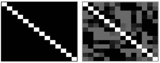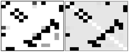 This section presents a pheromone smoothing strategy to escape from the stagnation situation. For a better understanding of the stagnation situation, visual representations of the pheromone trails obtained with AS when solving a TSP instance with 14 cities after 0, 5, 10 and 200 iterations are shown in Figure 2. Note that the pheromone matrix is a square matrix of dimension , where n is the number of nodes (cities) and in this TSP example, . Each element of the pheromone matrix contains the pheromone quantity associated with the edge that goes from node i to node j. For the representations, the pheromone levels are translated into gray scale, where black and white represent the highest and the lowest pheromone trail values, respectively. At the beginning of the algorithm, all the pheromone values are initialized with the same pheromone value , with the exception of the values of the diagonal representing no movement (i.e., ), which are not allowed in TSP (and thus are represented in white in Figure 2).