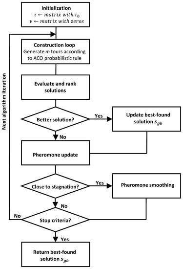 Furthermore, at the end of each algorithm iteration, it is checked whether the algorithm is entering a stagnation situation (line 16). The criterion considered for triggering the pheromone smoothing strategy described by Equation (10) is when the standard deviation of the fitness of the 80% of ants tours of the iteration is zero. Hence, the pheromone smoothing is applied before the algorithm enters stagnation. Finally, once the termination condition is met (maximum number of iterations) the algorithm returns the global best tour.