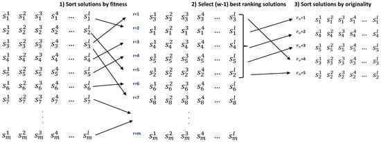 The steps of the algorithm are the following. First, the algorithm starts with the initialization of the pheromone table to a constant value , and of the matrix to zero (as accounts for the number of ants that have traversed each edge in the graph G). Within the main iteration loop, the tours of m ants are constructed component by component according to the ACO probabilistic transition rule given by Equation (1). Additionally, in line 7, the counter of ants that have traversed is updated. Once the m tours () have been constructed, they are ranked and selected according to their fitness and originality following the steps sketched in Figure 5 and explained as follows. First, all the tours are evaluated and the () best are selected (line 11). Then, the () best tours of the iteration are evaluated and ranked according to the originality utility function given by Equation (9), obtaining in this way a rank of the dissimilarity of the best tours with respect all the explored tours (line 13). Moreover, in the case that the best solution of the iteration is better than the global best solution, is updated (line 12). In line 14, the pheromone update process takes place according to Equation (11); all pheromone values are evaporated, and the () best tours of the current iteration and the global best tour are reinforced.