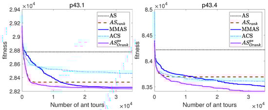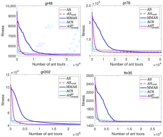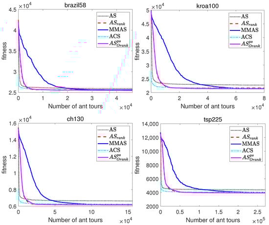 On the other hand, the evolutionary curves of Figure 6 and Figure 7, which represent the evolution of the average best-found tour lengths along the number of tours constructed, enable the comparison of the performance of the ACO algorithms along the runs of the algorithms, and not just the comparison of the fitness of final solutions. Note that these graphs allow to compare the performance of the algorithms at different iterations, but due to the scale, the comparison of the fitness of the final solutions is better observed in the comparative Table 5 and Table 6.