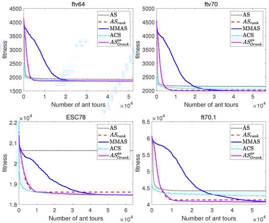 The comparative Table 5 and Table 6, and the evolutionary curves in Figure 6 and Figure 7 show the performance of several ACO algorithms: Ant System (AS) [], Rank-based Ant System (AS) [], Max-Min Ant System (MMAS) [], Ant Colony System (ACS) [] and the proposed extension of the Rank-based Ant System (AS).