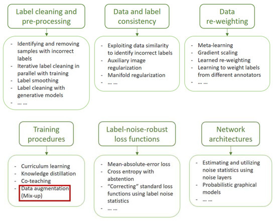 The overview of the state-of-the-art techniques of handling label noise in deep-learning-based approaches. The content was summarized based on Karimi et al. [39]. In this research, we chose “Data augmentation” by intermixing multi-source data to test whether the OBIA labels have potential to replace the Manual labels. The designation of experiments can be found in Section 2.5.