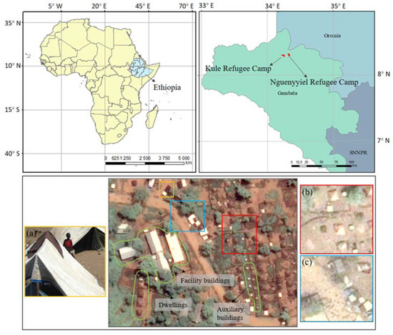 Kule and Nguenyyiel refugee camps are located in the Gambella region, Ethiopia. The Kule refugee camp was opened in 2014 in response to the major refugee influx from South Sudan and was fully occupied in 2016 [45]. The Nguenyyiel refugee camp was subsequently opened in 2016 to accommodate the influx of refugees from South Sudan due to the escalation of conflicts in July 2016 [46]. The location of the two camps together with the typical roof ontology of built-up structures can be found in Figure 2.