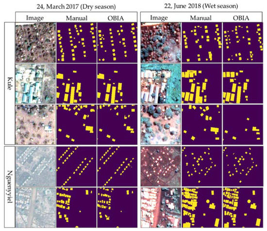 The examples of the OBIA labels and the Manual labels of built-up structures in the Kule and Nguenyyiel refugee camps during the dry and the wet seasons.