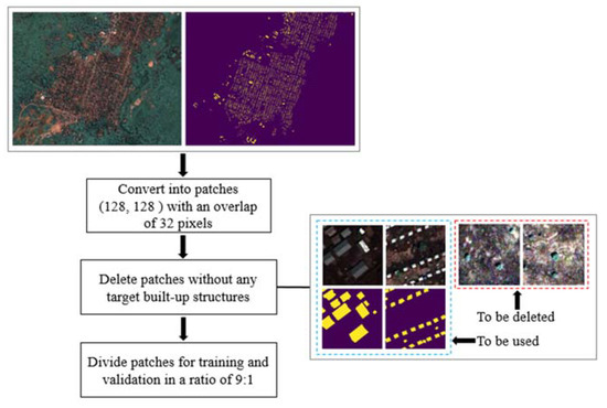 During data preparation, we firstly selected areas for training (and validation) and testing. The dimensions of the selected areas were kept the same for each camp across two seasons. Secondly, the selected training (and validation) data were converted into patches with an overlap of 32 pixels in a shape of (128, 128) pixels. This patch size has been applied in related research and proved to be effective [33]. Thirdly, we deleted patches without any target built-up structures to reduce the redundancy of the class Background, in turn, to improve training speed and reduce the imbalance between the class Target built-up structures and the class Background. Following that, the produced patches were divided into training patches and validation patches at a ratio of 9:1. The data preparation process is briefly shown in Figure 4 below. Table 1 shows the number of training and validation patches for the OBIA labels and the Manual labels.