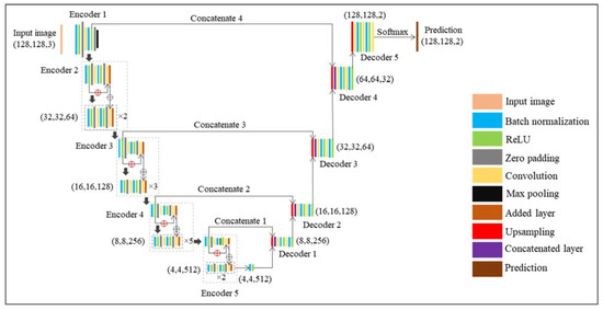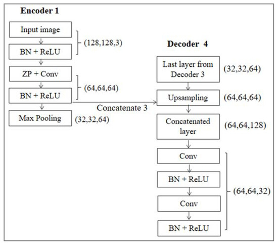 Figure 5 presents its general structure. Overall, there are five encoder units (Encoder 1, 2, 3, 4, and 5) and five decoder units (Decoder 1, 2, 3, 4, and 5) in ResNet34-UNet. Encoder 1 (seen in Figure 6) converts an input image with a shape of (128, 128, 3) to a set of feature maps with a shape of (32, 32, 64) after a batch normalization (BN) layer, an activation layer, a zero-padding (ZP) layer, a convolution (Conv) layer, a second BN layer, and an activation layer together with a max-pooling layer. The output of the second ReLU layer will be connected to the first layer of Decoder 4. Here, we used rectified linear unit (ReLU) as the activation function. Encoders 2, 3, 4, and 5 are residual units, and they share the same basic structure as Encoder 1.