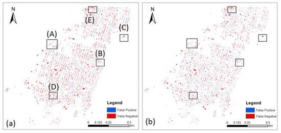 Overall, we can observe the two models share a similar spatial distribution of FP and FN pixels, but the OBIA-OCOS model produced more falsely predicted pixels. We selected five typical examples (A)–(E) to further show the prediction differences between the two models, as shown in Figure 9. In general, we found four main sources of errors coming from facility buildings, trees, boundaries, and brown cloth on the rooftop of dwellings.