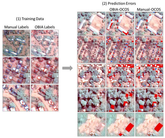 (1) The annotated errors in the original OBIA labels and (2) examples (A–E) showing the differences in FP (blue) and FN (red) pixels between the OBIA-OCOS model (middle) and the Manual-OCOS model (right) from the Kule Wet case.