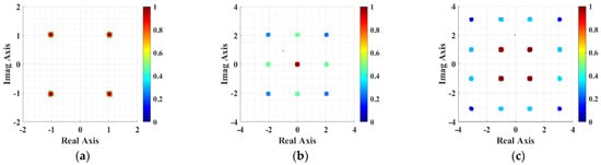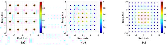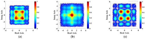 Figure 2a–c and Figure 3a–c are the probability density figures (PDFs) of QPSK and 16QAM constellations when performing 1-level polybinary transformation, duobinary transformation and tribinary transformation, respectively. The colors from red to dark blue represent the level of probability density of the constellation points; the red color denotes a high level and the blue color denotes a low level. Besides the aforementioned phenomena, the number of constellation points changes after the polybinary transformation. Figure 2 shows that the number of constellation points changes from 4 points to 9 points and 16 points when the original QPSK signal undergoes duobinary transformation and tribinary transformation, respectively. Figure 3 shows that the number of constellation points changes from 16 points to 49 points and 100 points for the original 16QAM signal after duobinary transformation and tribinary transformation, respectively.