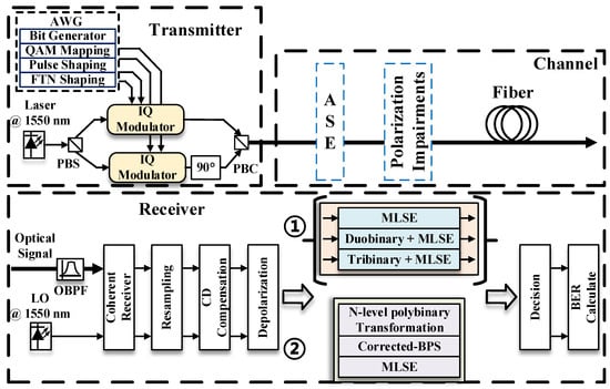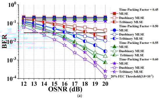 The spectrum efficiency (SE) is one of the most significant parameters in optical communication systems; hence, the question of how to improve the SE is crucial [1,2,3,4,5,6]. Several methods can be adopted to increase the SE, in which the Faster than Nyquist (FTN) technique is one of the most favorable methods. In the FTN system, the ratio between the signal’s bandwidth and the baud rate is called the time-packing factor, indicating the amount of increase in SE that can be obtained. With a given baud rate, the bandwidth reduction in the occupied signal means a higher SE, while, at the same time, it induces inter-symbol interference (ISI). Generally, ISI needs to be mitigated by decoding algorithms, such as the maximum-likelihood-sequence estimation (MLSE) algorithm [7] and Bahl–Cocke–Jelinek–Raviv (BCJR) algorithm [8].