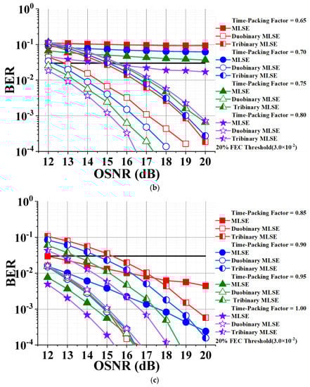 The performance of OSNR versus BER for MLSE, duobinary MLSE and tribinary MLSE under different time-packing factors: (a) the time-packing factor changes from 0.45 to 0.60; (b) the time-packing factor changes from 0.65 to 0.80; (c) the time-packing factor changes from 0.85 to 1.00.