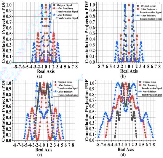 In order to conduct an in-depth analysis, we attempt to convert the two-dimensional constellation PDF along with the real and imagined axes in Figure 2 and Figure 4 into a one-dimensional constellation projection PDF only along with the real axis, as shown in Figure 7. We take four cases in which the time-packing factor equals 1.00, 0.95, 0.65 and 0.45 as examples, respectively. Figure 7a–d show the abovementioned constellation projection PDF graphs corresponding to the time-packing factors of 1.00, 0.95, 0.65 and 0.45, respectively. Note that, in Figure 7a–d, the received signals are both exercised with 1-level polybinary transformation (equivalent to the original signal), duobinary transformation and tribinary transformation.