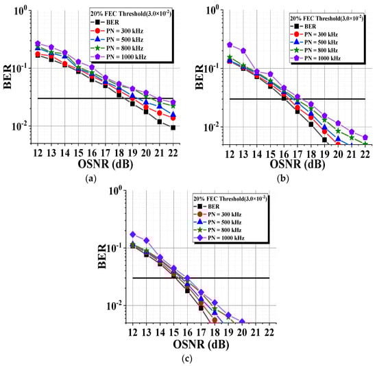 To verify the performance of the modified-BPS algorithm for compensating for PN in the FTN system with a smaller time-packing factor, we perform simulations on our platform, as shown in Figure 5. Note that the received signal will pass through module ② in Figure 5, which means that we take the linewidth of the lasers into account. The linewidth of the laser at the transmitter is set to be 300 kHz, 500 kHz, 800 kHz and 1000 kHz, respectively. We also assume that other channel impairments besides ISI have been equalized by corresponding DSP algorithms. The time-packing factor changes from 0.45 to 0.55. In module ②, the sequence that the received signal passes through the algorithm is as follows: (1) firstly, we utilize the duobinary or tribinary transformation for the received signal to eliminate the overlap of the constellation points; (2) secondly, the signal passes through the modified-BPS to compensate for PN after duobinary or tribinary transformation; (3) thirdly, the signal passes through the MLSE algorithm to eliminate ISI after compensating for PN. Figure 8a–c show the BER as a function of OSNR, which demonstrates the effectiveness of the modified-BPS algorithm to equalize PN in relation to the linewidths of 300 kHz, 500 kHz, 800 kHz and 1000 kHz in the FTN system with the different time-packing factors. In this paper, the linewidth of laser Δf is defined as the full width at half maximum (FHWM). Figure 9a,b show the required ONSR and OSNR penalty versus the product of the linewidth and symbol period (Δf·Ts) for the modified-BPS algorithm in the FTN system with the different time-packing factors, respectively. We call the product of the linewidth and symbol period (Δf·Ts) the linewidth symbol rate. The FEC threshold is 3.0 × 10−2, corresponding to soft-decision 20% FEC.