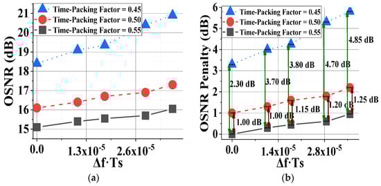 We can see in Figure 8a–c that the modified-BPS algorithm can effectively compensate for 300 kHz, 500 kHz, 800 kHz and 1000 kHz linewidths with the time-packing factor of 0.45–0.55. Figure 9a shows the required OSNRs for the modified-BPS algorithm with the Δf·Ts parameter values of 0, 1.07 × 10−5, 1.79 × 10−5, 2.86 × 10−5 and 3.57 × 10−5 when the time-packing factor takes values within 0.45–0.55. To observe and compare the results conveniently, the required OSNRs for the modified-BPS algorithm with different time-packing factors and Δf·Ts are listed in Table 1. To measure the OSNR penalty, we set 15.10 dB as the standard benchmark that corresponds to the case of a time-packing factor of 0.55 and Δf·Ts of 0. Moreover, Figure 9b shows the OSNR penalties for the modified-BPS algorithm under the same conditions as Figure 9a, and the results are listed in Table 2.
